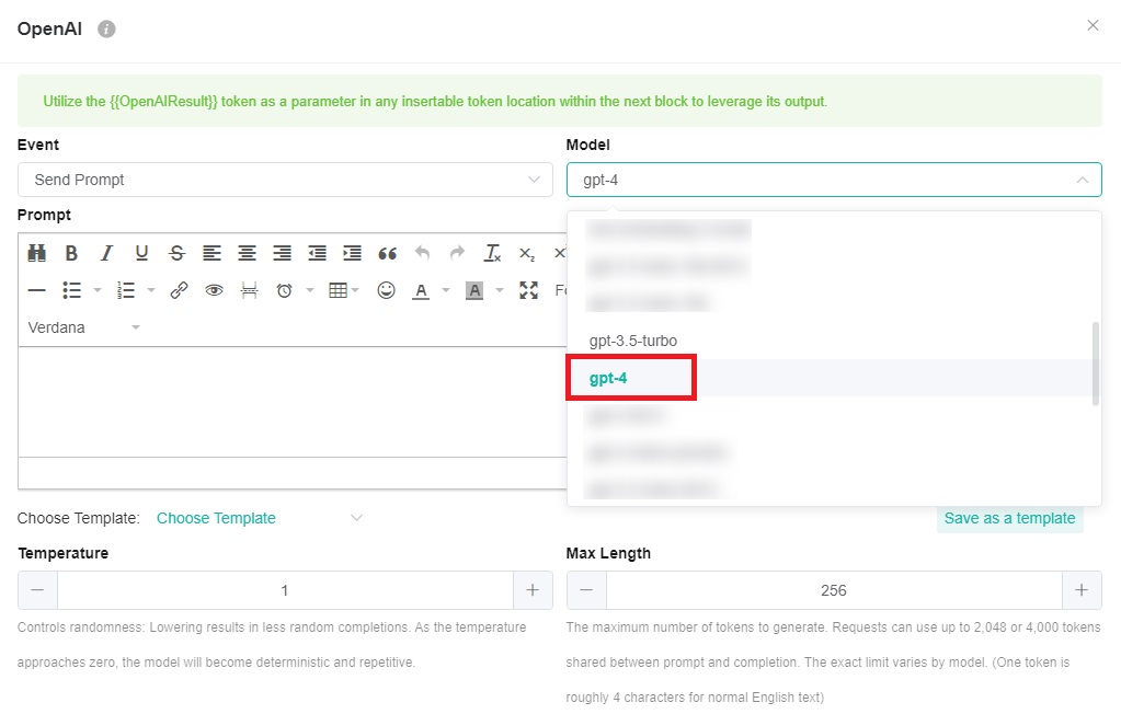Now, when you use the Open AI bot block in Bots, you have the option to select from the models available in your OpenAI integration. If your OpenAI integration supports the GPT-4 model, then you can also select the GPT-4 model.