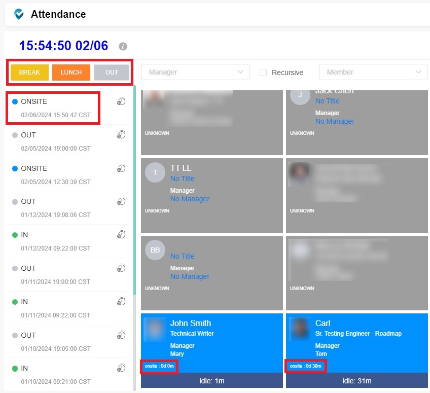 Additionally, your ONSITE status and duration are displayed on your personal card in the Attendance app, allowing other team members to have a clear understanding of your working status.