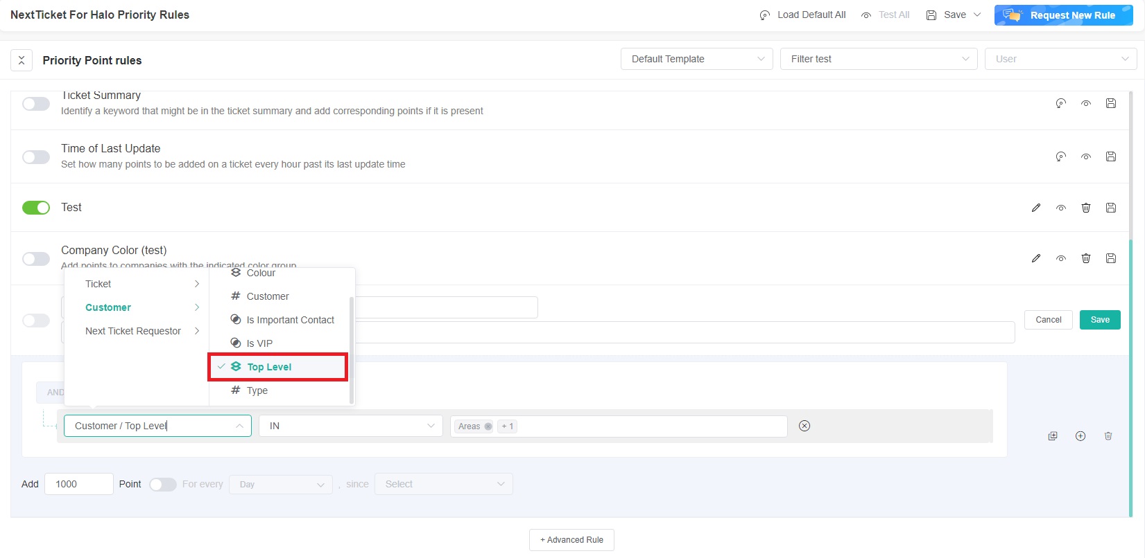 You can now select the newly added field in the advanced priority rules of NextTicket for Halo - Top Level. This new field can be found in the "Customer" category.