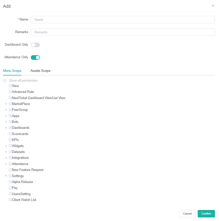 The "Attendance Only" switch is similar to the "Dashboard Only" switch, and these two switches are mutually exclusive, meaning you can only select one at a time or not select either one. You can edit the "Dashboard Only" and "Attendance Only" switches when creating a new role, but they are disabled when editing existing roles.