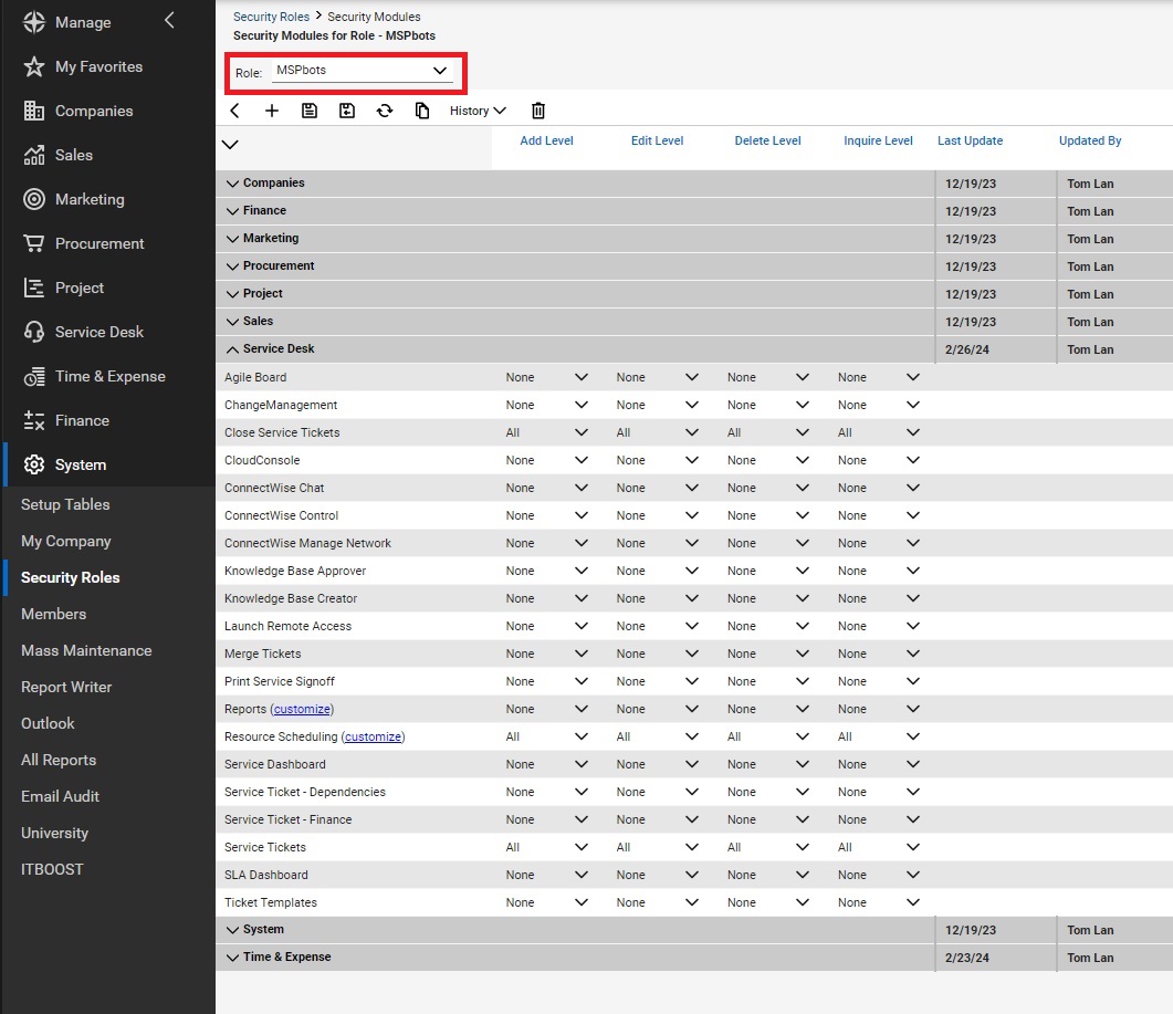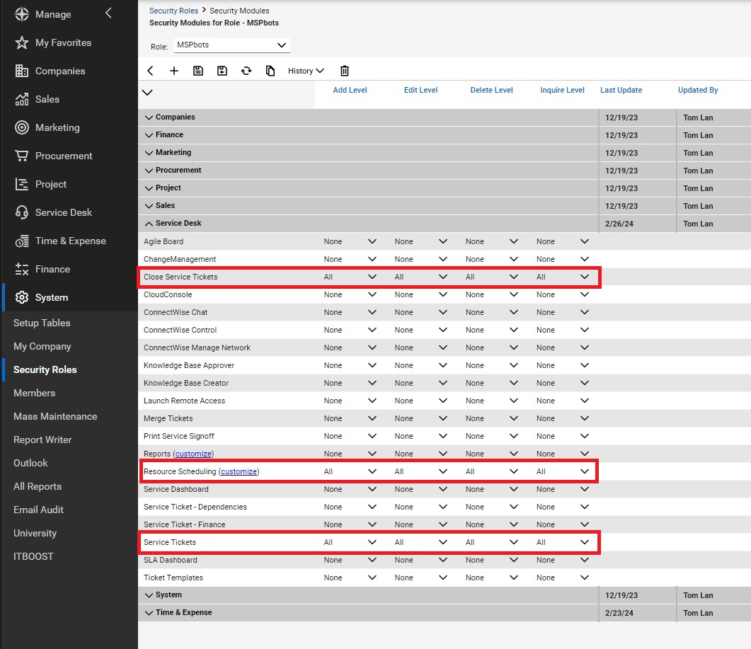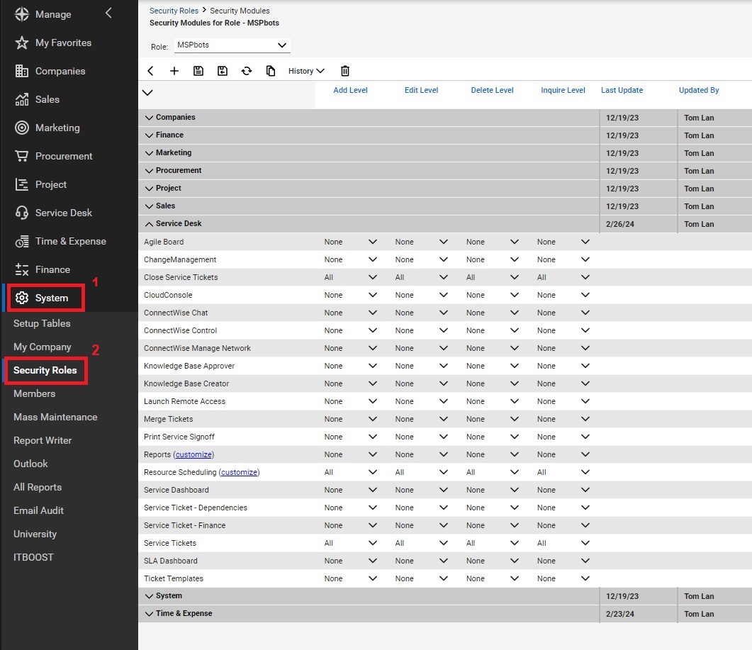 Follow the steps below to grant MSPbots access permissions in ConnectWise Manage.