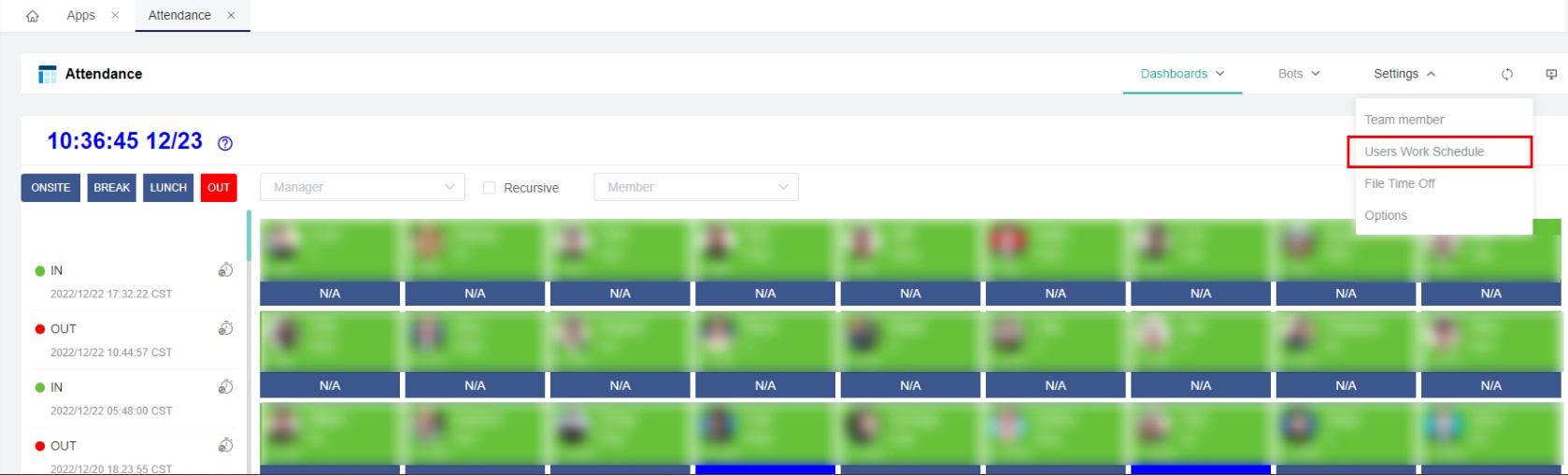 Next, on the Attendance tab, go to Settings and select Users Work Schedule from the dropdown menu.