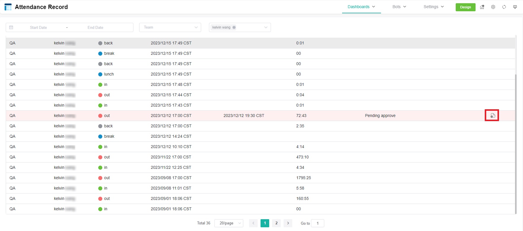 - On the Attendance Record list, select your team from the Team filter to show only team members with pending approval requests.