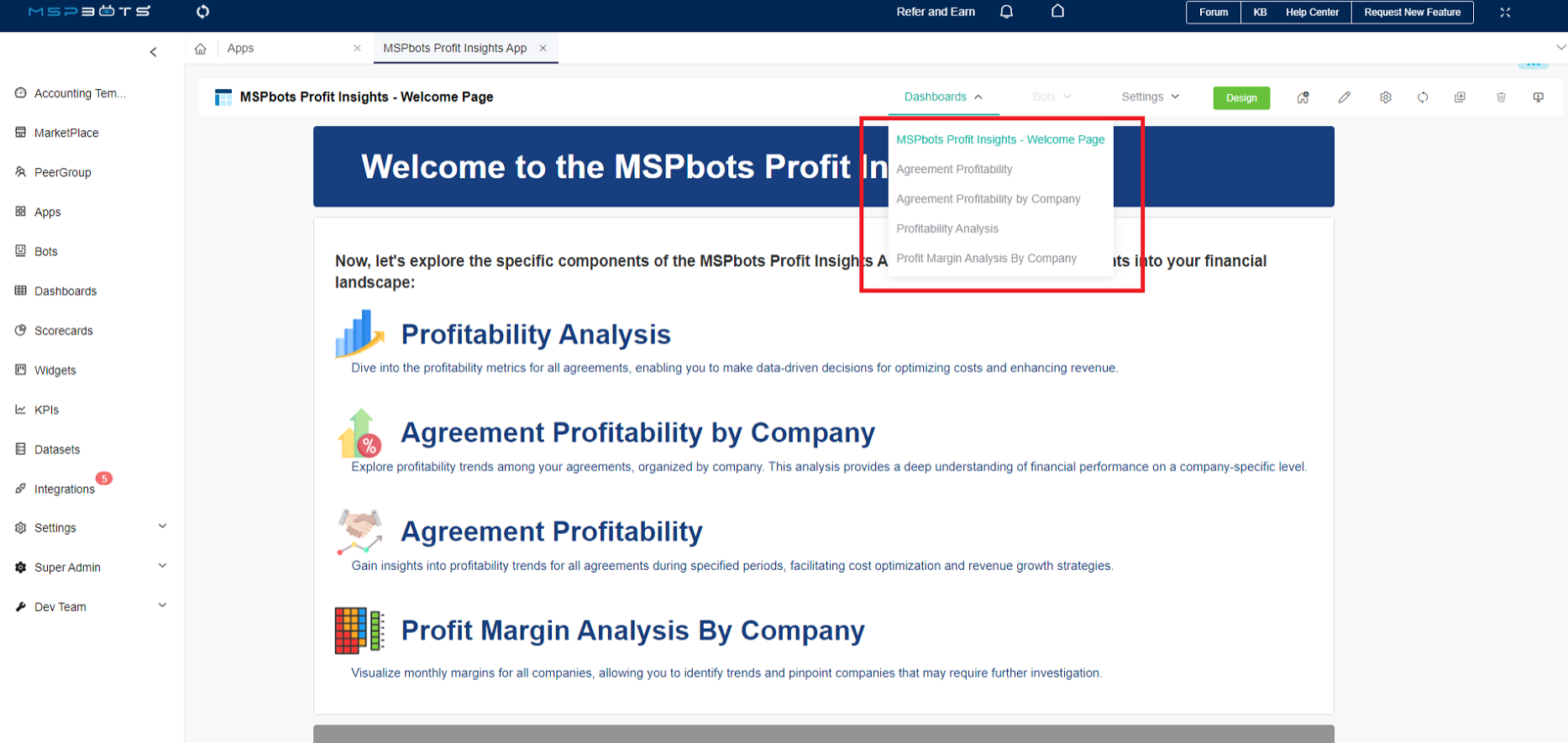 Each of the MSPbots Profits Insights App dashboards offers unique insights into your financial landscape. These dashboards are discussed below.
