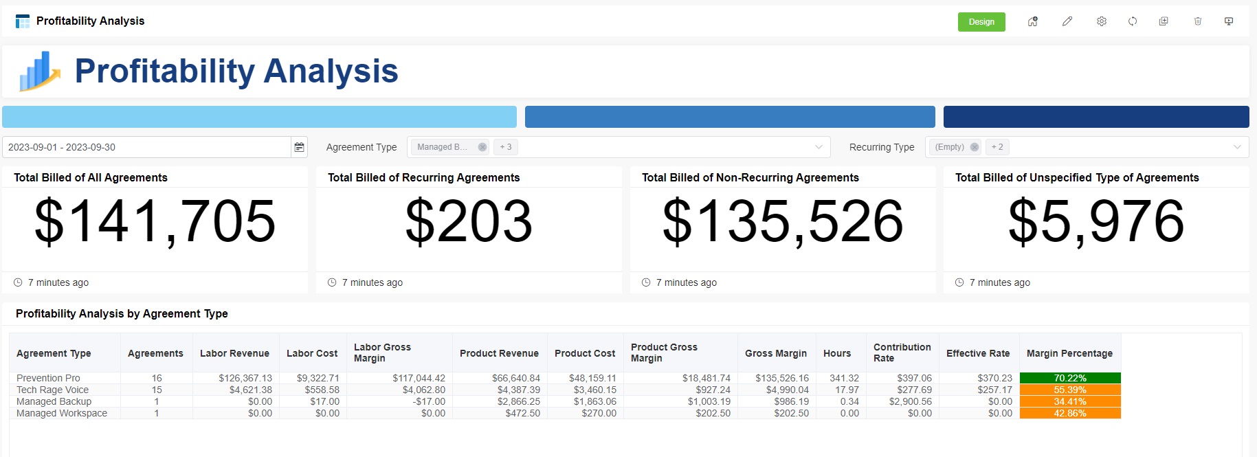 The Agreement Profitability by Company dashboard offers a detailed analysis of the profitability of all agreements organized by company during a specified time. Other than providing insights into financial performance, it also highlights crucial trends related to Margin Percentage, Contribution Rate, Total Billed by Recurring Type, and Total Actual Hours by Recurring Type. By examining these key profitability metrics, businesses can gain a comprehensive understanding of their financial health, enabling them to make informed decisions, optimize costs, and formulate strategies for revenue growth and enhanced profitability.