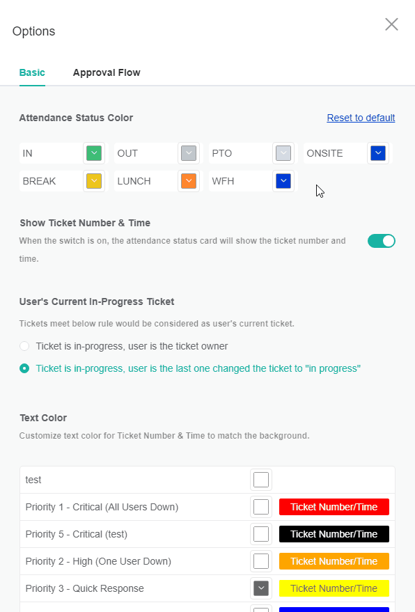 When the switch is ON, the Attendance status card displays the ticket number assigned to the technician and the time he has spent on the ticket. The card shows the idle time if the technician is not working, and nothing will be displayed if the switch is OFF.