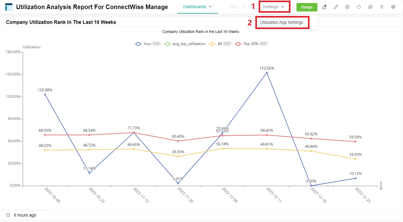 - On the Utilization Analysis Report For ConnectWise Manage screen, point to Settings, and then click Utilization App Settings.