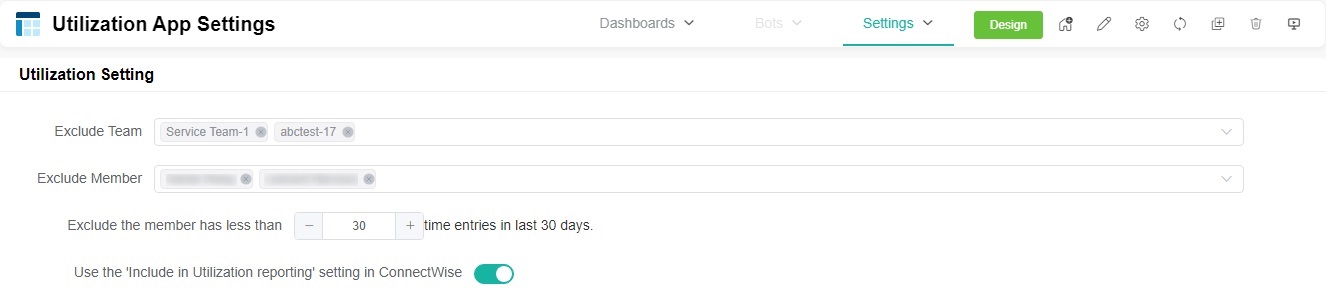 Please note that when you toggle the Use the 'Include in Utilization reporting' setting in ConnectWise switch, the option Included in Utilization reporting set within the ConnectWise Manage app will override the Exclude Member setting in the Utilization Analysis Report for ConnectWise Manage app of MSPbots.