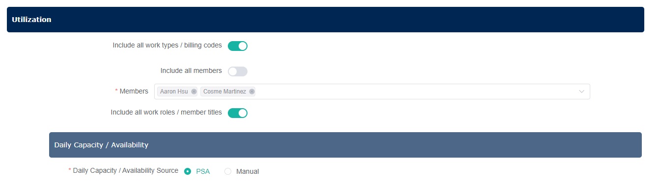 - Next, for Daily Capacity / Availability, ConnecWise and Autotask users may select the PSA option to add members automatically.