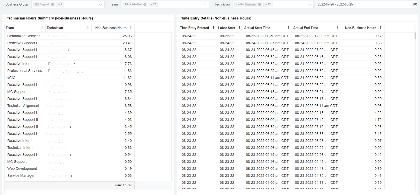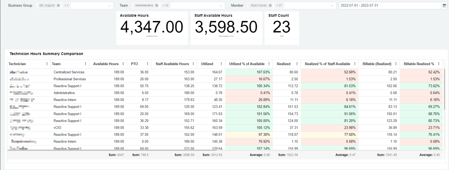 | Utilized Hours | Actual hours worked excluding time entries with PTO work types as set in the ConnectWise PSA Team Utilization Settings |