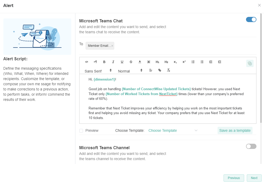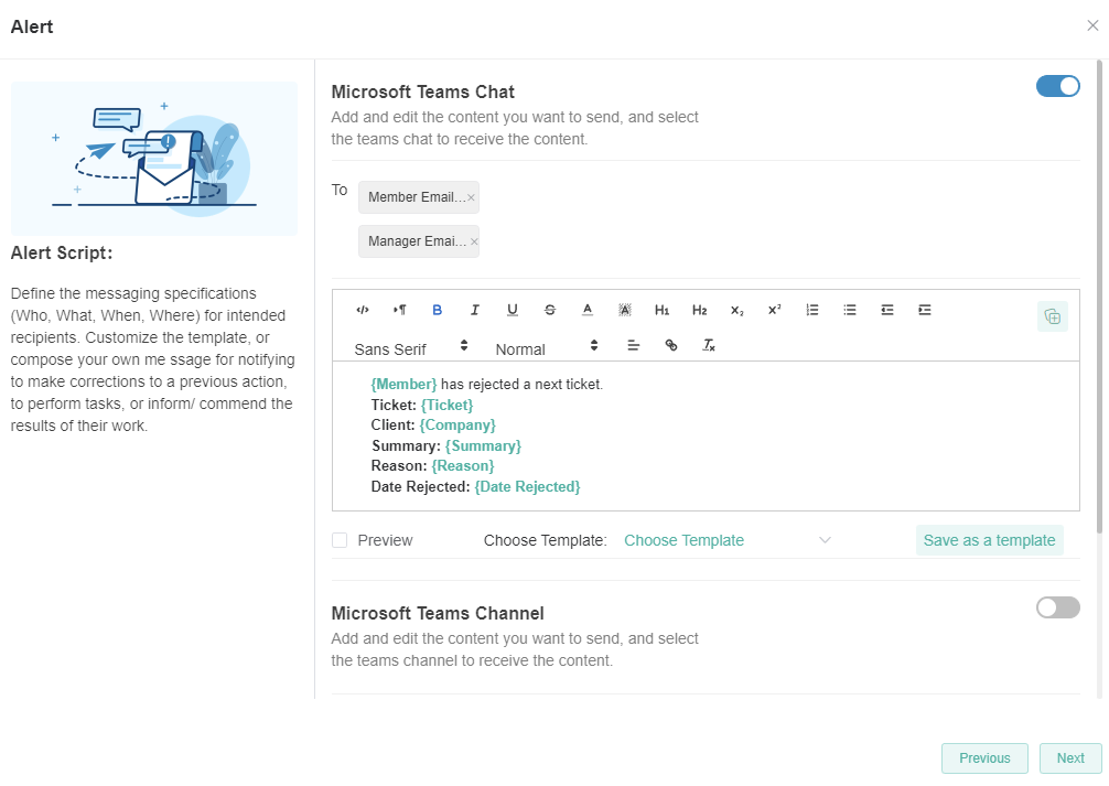 The Alert toggle switch enables the sending of alerts. Switching it ON sends the alert messages to managers and members based on the conditions in the alert script setup. Alerts may be sent through Teams chat, Teams channel, email, or web messages. This switch is OFF by default.