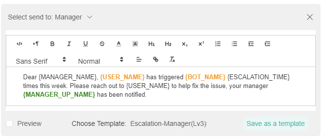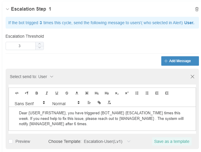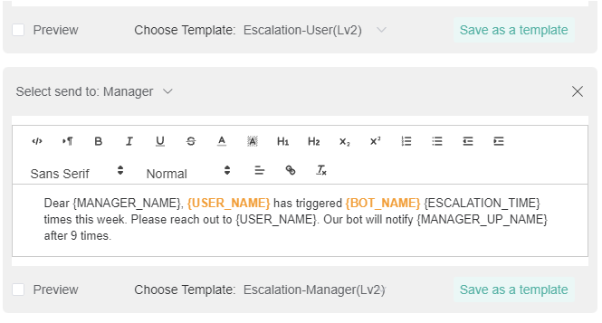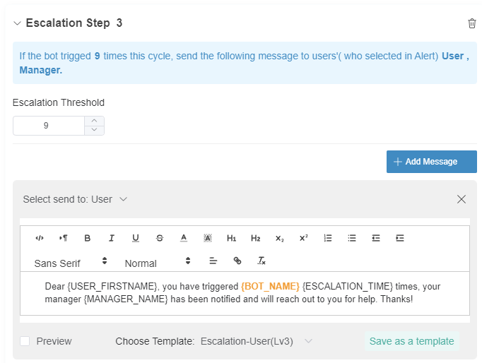 The Escalate switch enables the bot to send an escalation message to the person or manager specified in the escalation setup. Escalation scripts are sent whenever members fail to perform tasks or corrective actions. This switch is OFF by default.