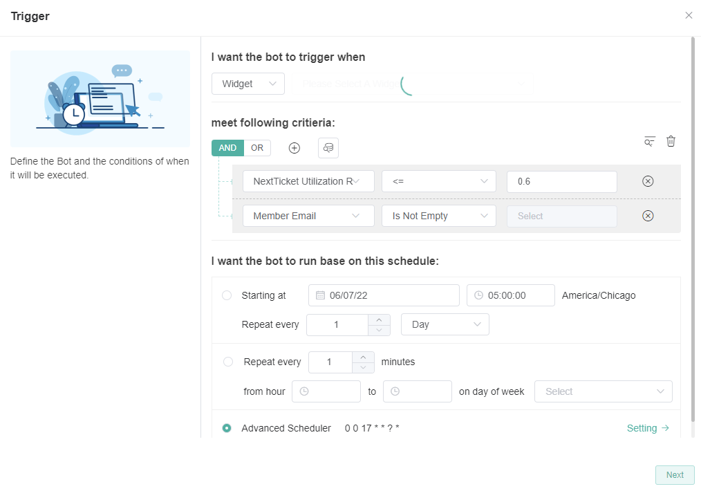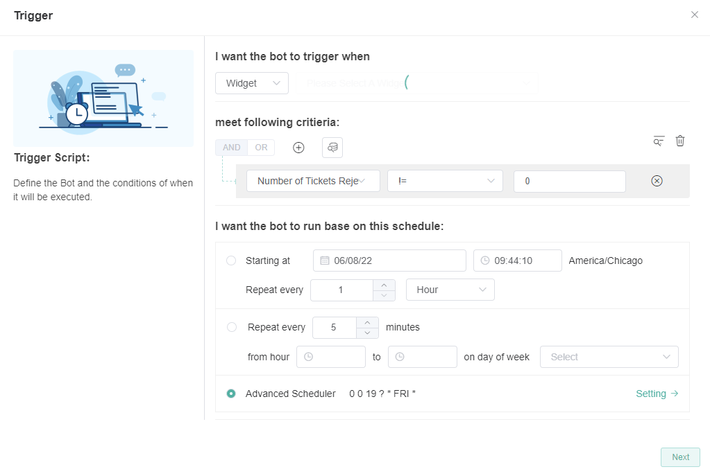 - Hover over Bots in the upper-right corner to show the NextTicket bots.