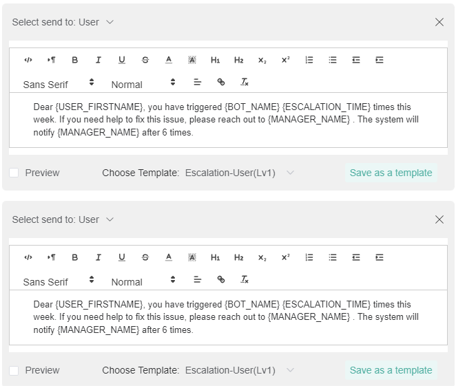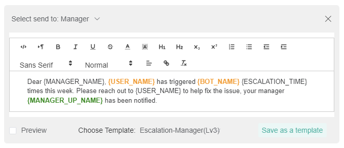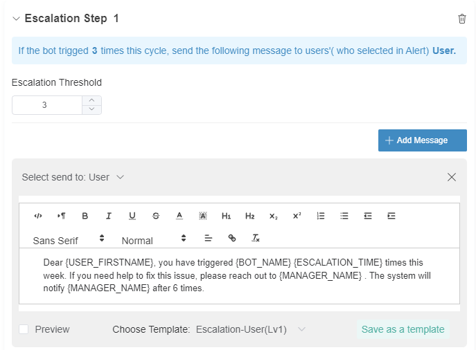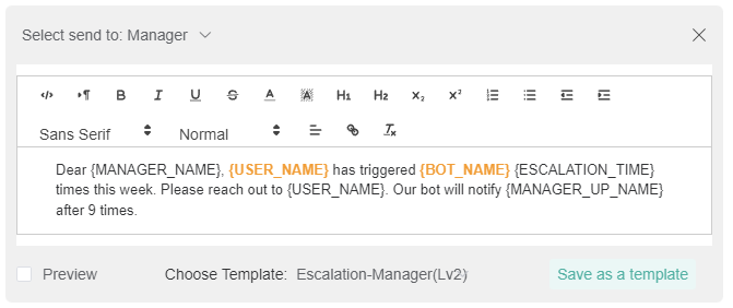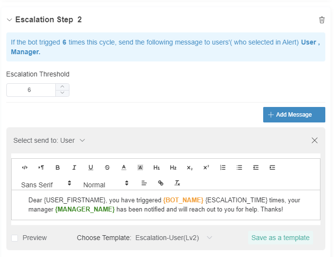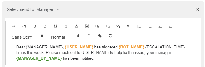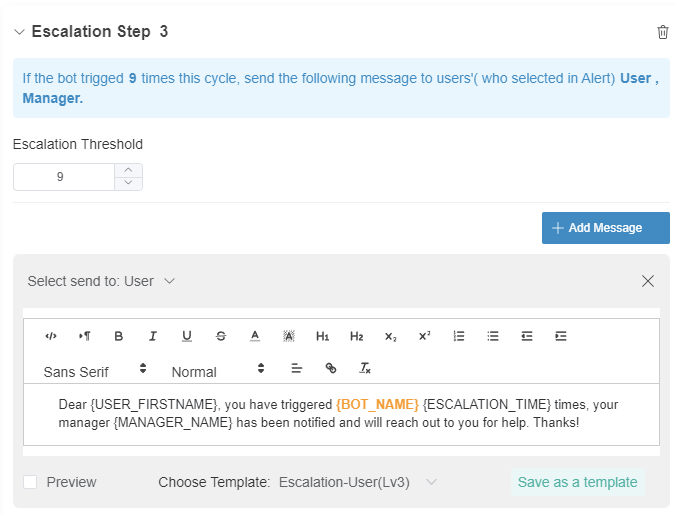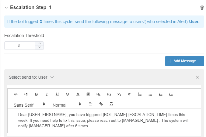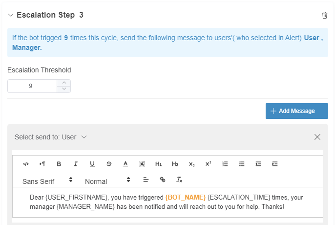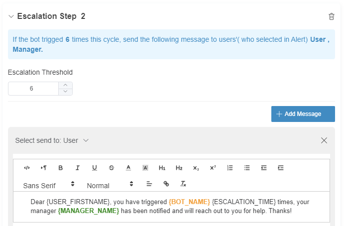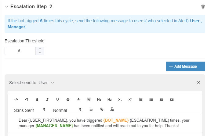 The Escalate switch enables the bot to send an escalation message to the person or manager specified in the escalation setup. Escalation scripts are sent whenever members failed to perform tasks or corrective actions. This switch is OFF by default.