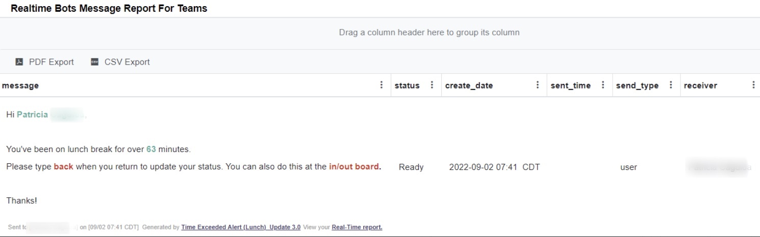 The Time Exceeded Alert (Lunch) bot reminds users to clock BACK in when they forget to log back in within the maximum time allowed for lunch. You can modify the maximum time by editing the bot's trigger criteria.