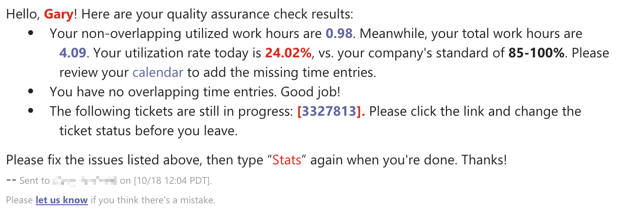 The Tech Stat Reviewer bot helps users reach an 85% daily utilization rate and minimize overlooked issues, and sends reminders about the following: