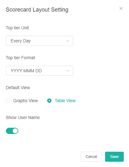 - Configure the following fields in the Scorecard Layout Setting window, then click Save.