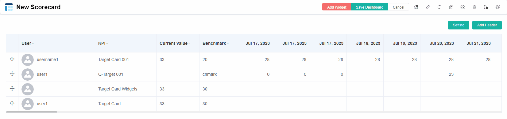 - Click the Add Header button to add a header to the scorecard dashboard.
