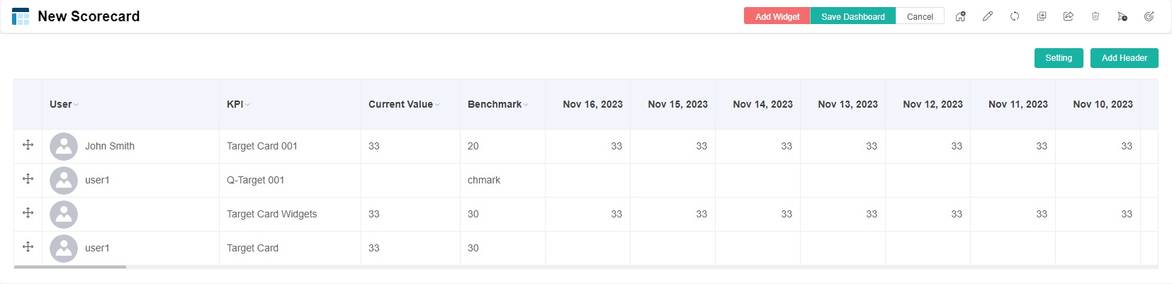 - Only target card widgets are shown in the scorecard dashboard.
