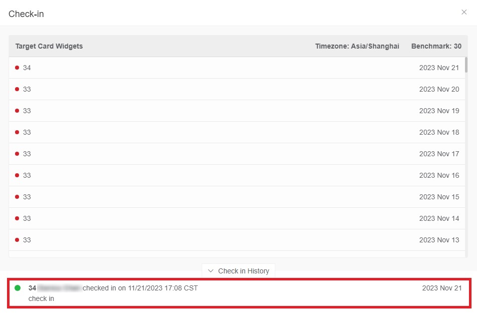 The Check in History records the modifications on the field values and the comments added to certain fields. You can click Check-in History to view these modifications. If you added comments to the fields of key performance indicators in the scorecard dashboard, you can quickly identify the key indicators from the comments.