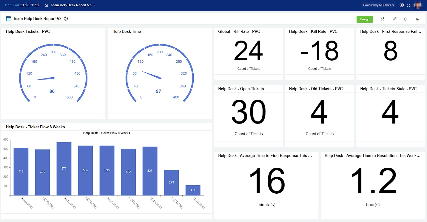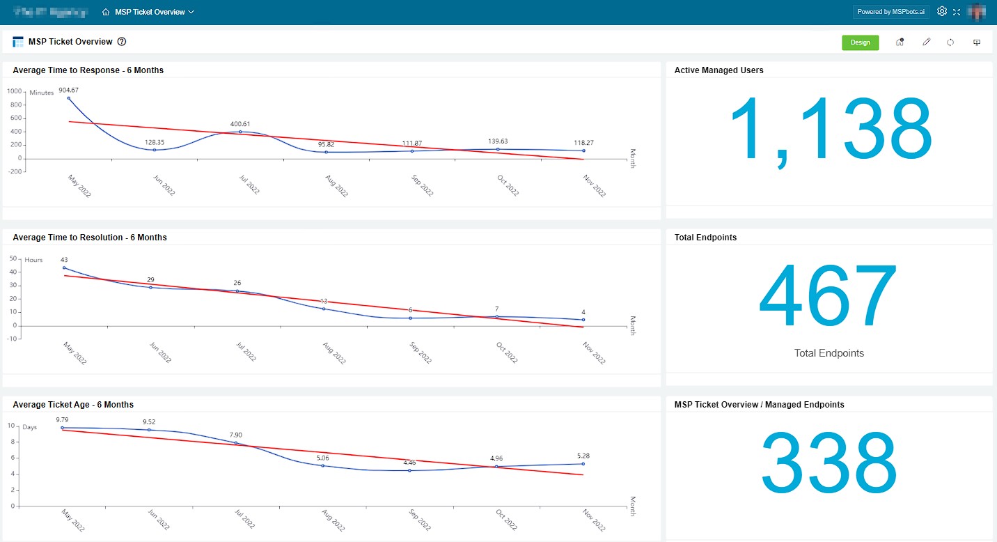 The Client Portal Dashboard gives users a real-time view of a client's ticket status, response, and resolution. The drill-down and slicers feature customizes the data on each widget and allows the results to be filtered per client.