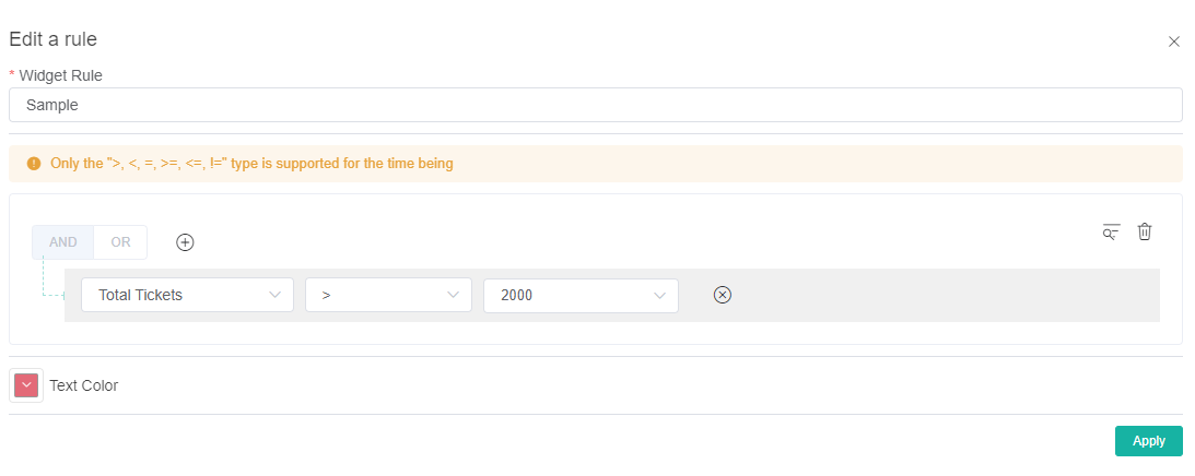 - Set a condition or logic for each field using the next two dropdown menus. For a guide on each option, refer to What Filter Conditions and Formats are Available for Creating Widgets.