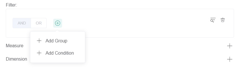 For a guide on each option on the list, refer to What Filter Conditions and Formats are Available for Creating Widgets. - Select the logical operator AND or OR for the filter group.