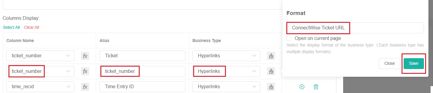 - Click the paintbrush icon and select ConnectWise Ticket URL from the Format dropdown list.