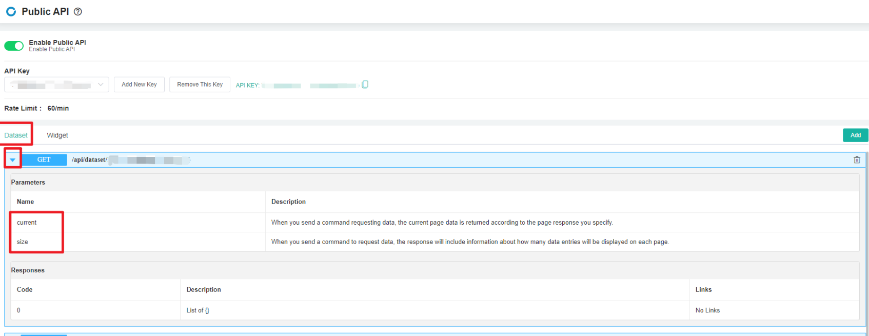 - Go to the Public API tab, click Datasets, and hit the Add button.