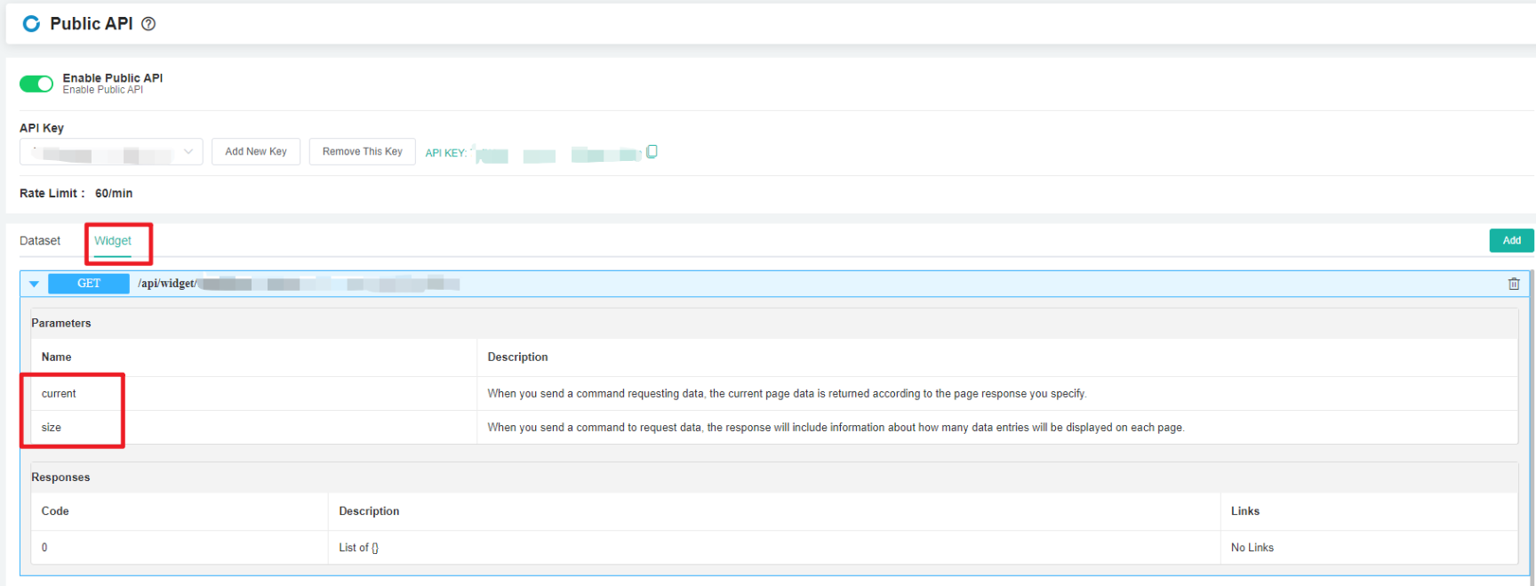 - Go to the Public API tab, click Widget, and hit the Add button.