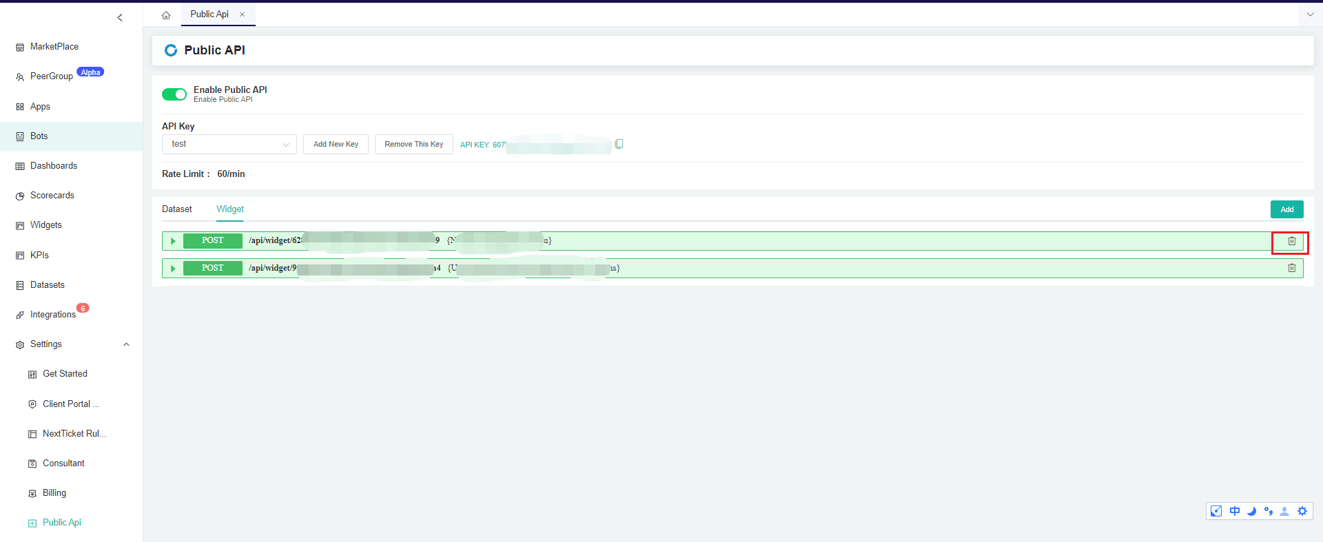 The Public Application Programming Interface (API) function is an interface that allows sharing your datasets and widgets with your clients. In the Public API section of the MSPbots app, you can create, share, and delete your own API key. Once you have made and shared your public API, your clients can access the datasets and widgets assigned to that key.