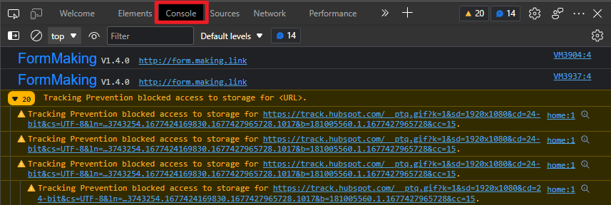 - Click Console and take a full screenshot. We need the yellow warning and red error messages to help identify the issue.