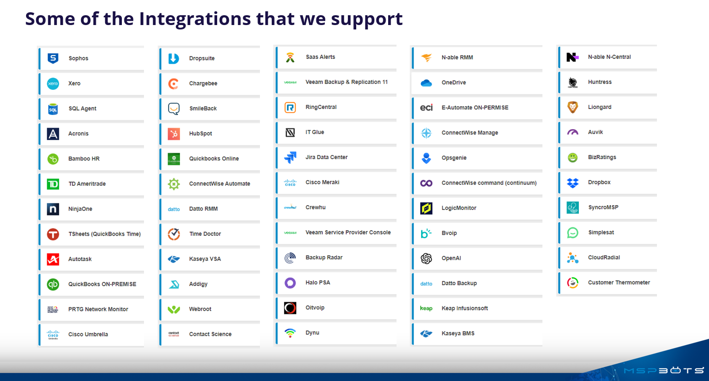 MSPbots supports a wider range of integrations with the best and the newest software and tools for MSPs. With more than 70 integrations, MSPbots offers combined features from multiple platforms and continuously adds more to provide a growing, more comprehensive, and powerful toolset.
