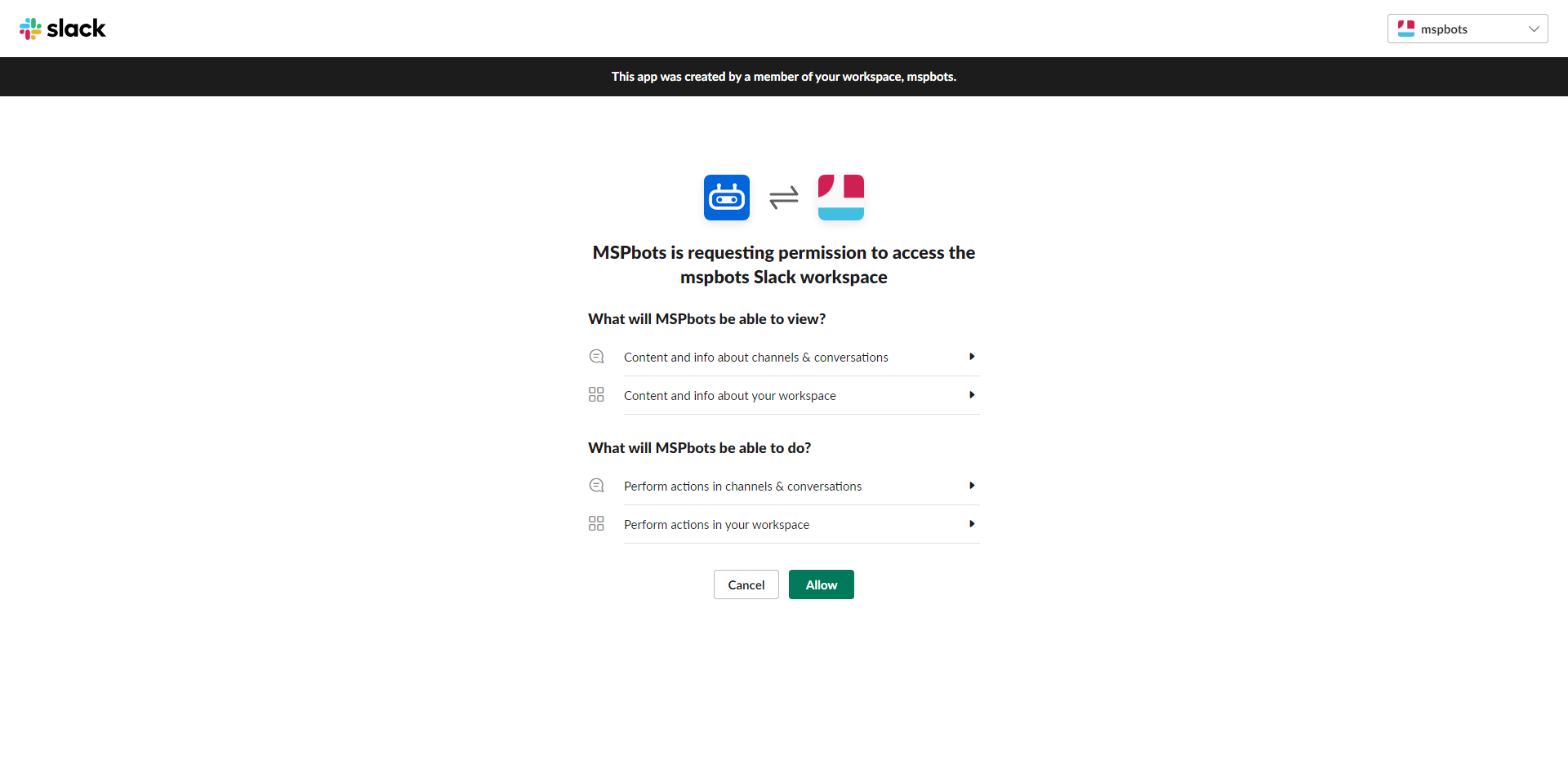 - On the page where MSPbots is requesting access to Slack, click Allow.