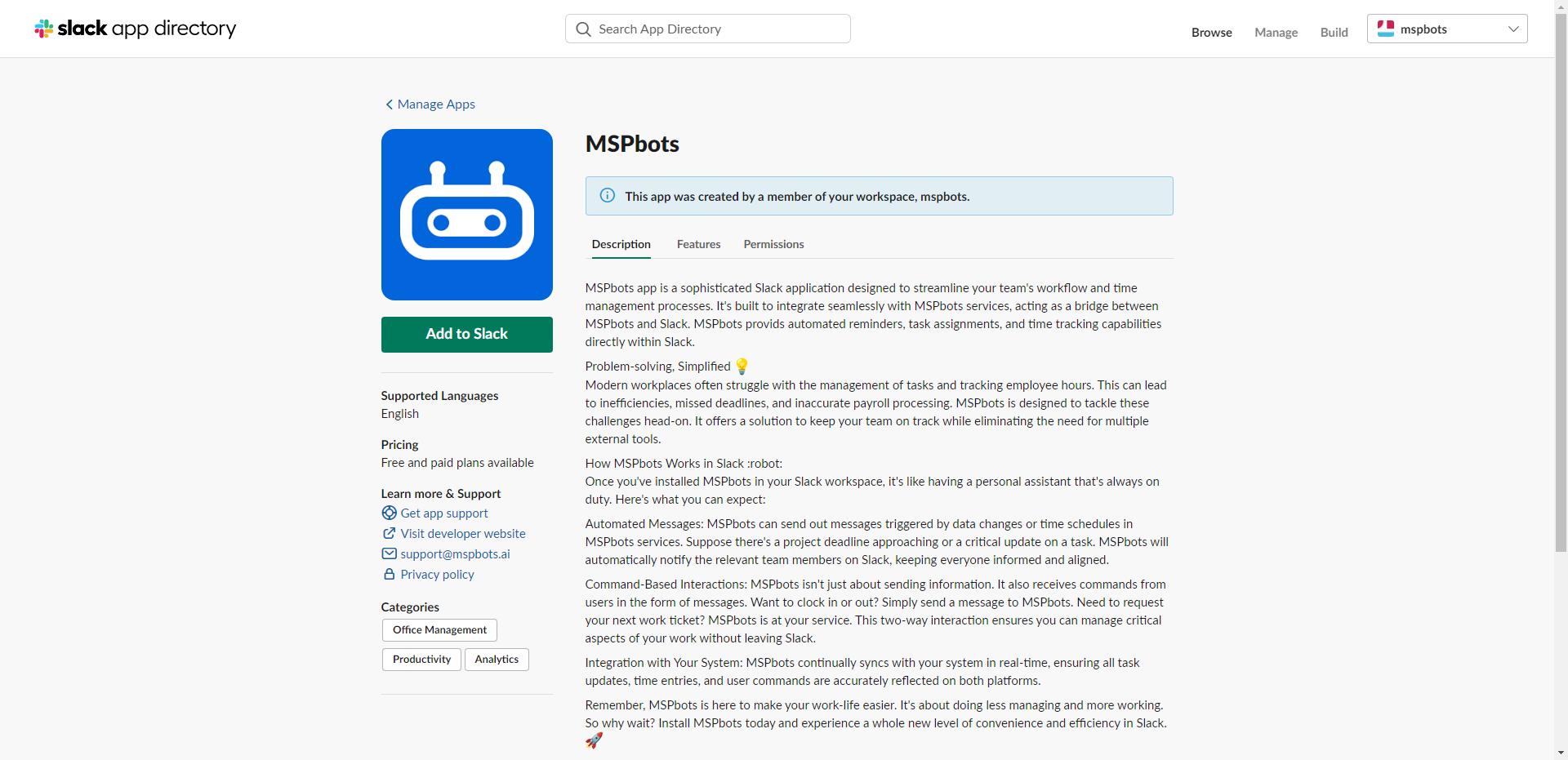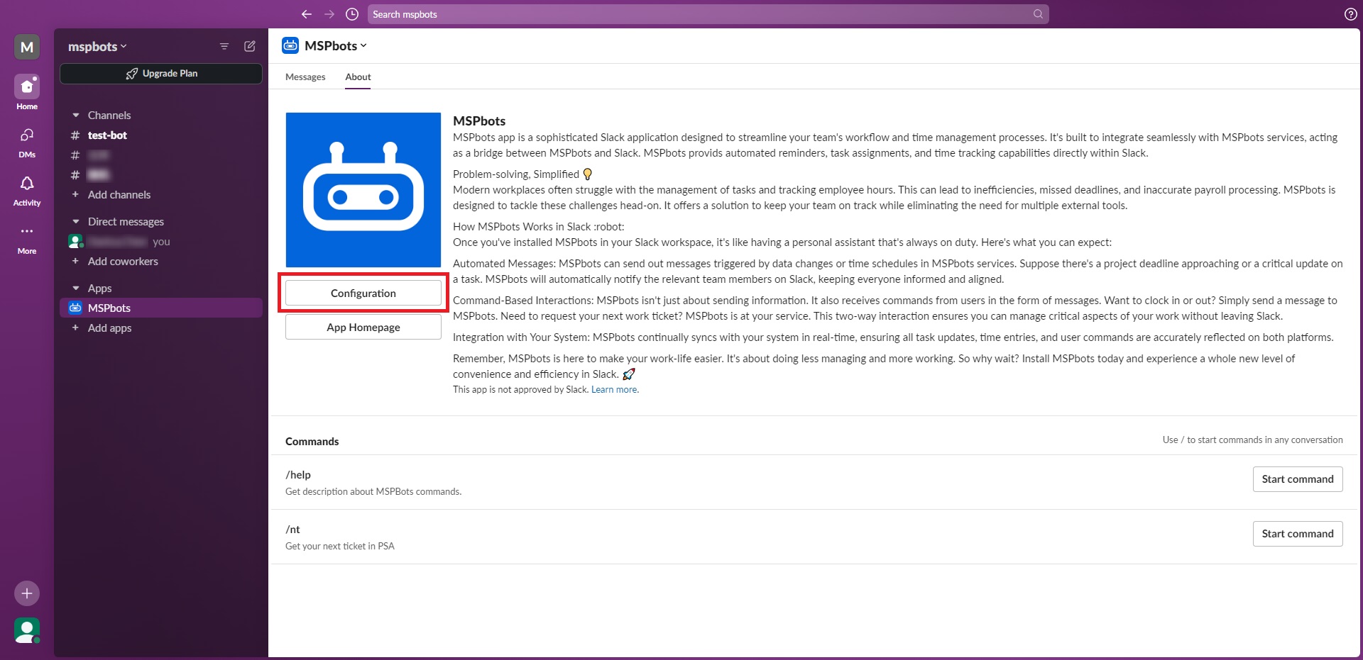 3. Verify the installation of the MSPbots app in Slack and test the commands.