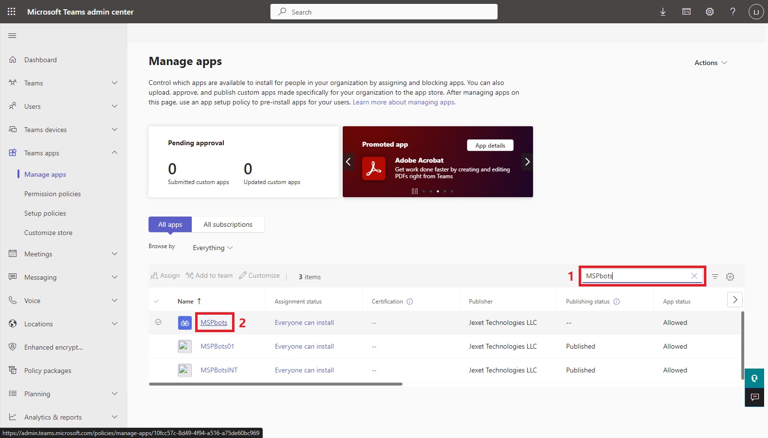 Under the All apps tab, search for MSPbots and click on it. The App status of MSPbots should be Allowed at this point.
