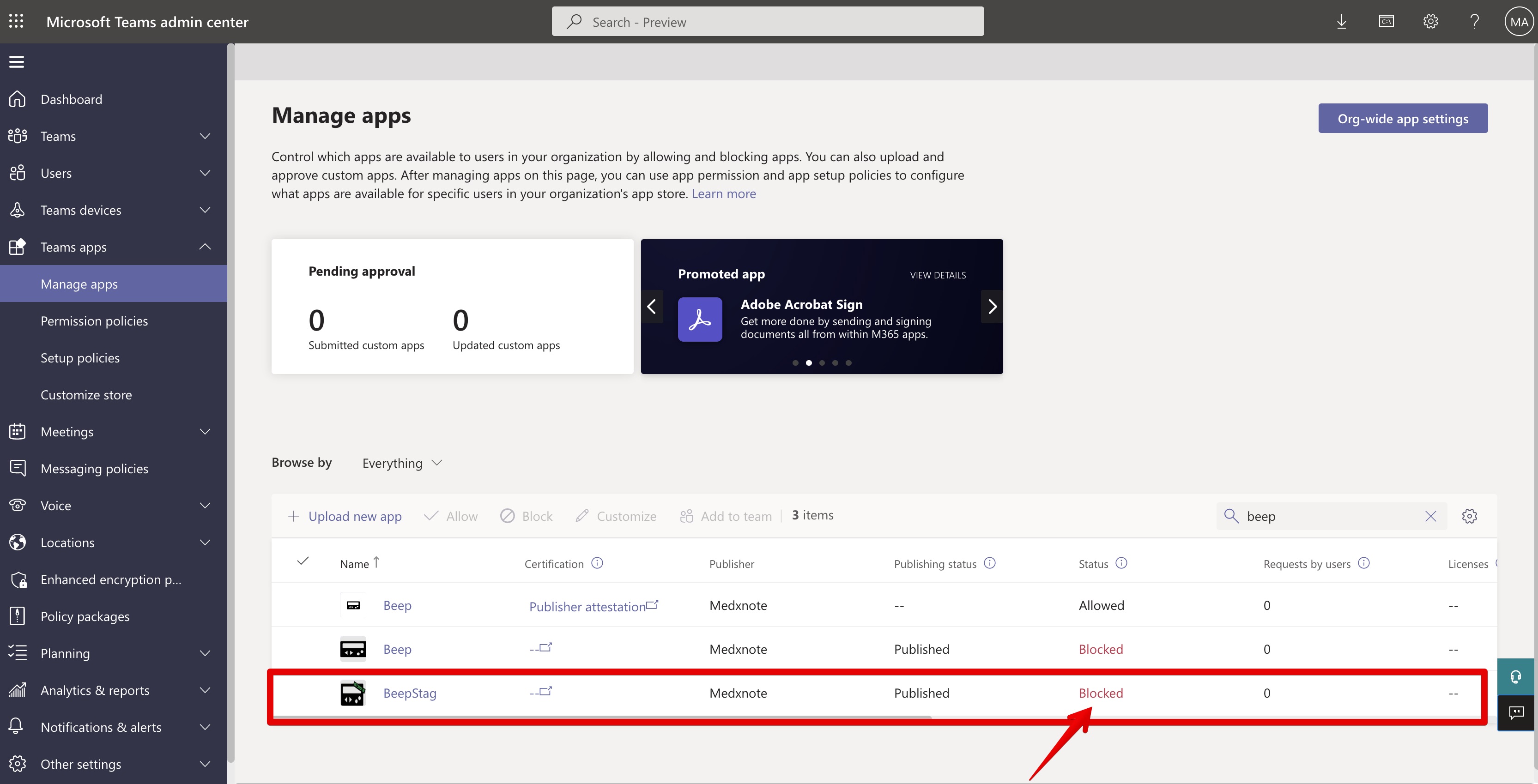 Go back to the Manage apps page and confirm that the App status of MSPbots is now Blocked. This means that you have successfully removed the MSPbots app from Teams.