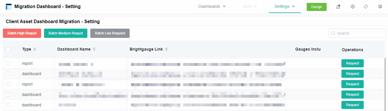 Client Asset Dashboard Migration - Setting. This dashboard lists the BrightGauge assets available for migration and shows details like Brightgauage Link, Dashboard Name, Gauges Included, Operations, and Type. This is where you select assets and request their migration. To view the Client Asset Migration - Setting dashboard, open the Brightgauage Migration app and go to Settings > Client Asset Dashboard Migration - Setting.