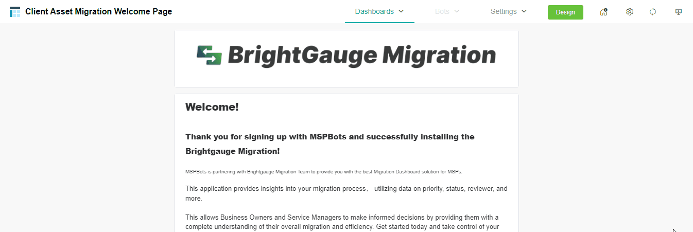 The BrightGauge Migration app is a tool within MSPbots that helps you request and monitor your data migration from BrightGauge. This app facilitates in identifying which assets (dashboards, scorecards and reports) you want migrated, as well allowing you to set the proper prioritization of each. This article discusses more about this app and shows how you can request, prioritize, and monitor the migration of your assets overall.